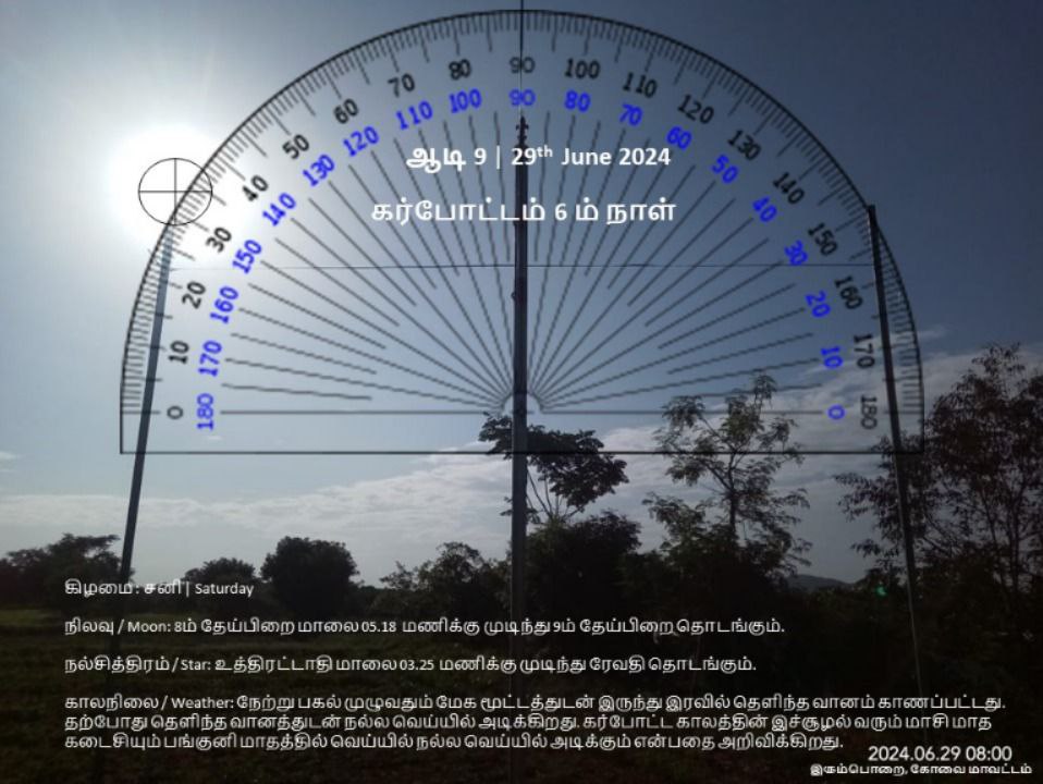 நேற்று பகல் முழுவதும் மேக மூட்டத்துடன் இருந்து இரவில் தெளிந்த வானம் காணப்பட்டது. தற்போது தெளிந்த வானத்துடன் நல்ல வெய்யில் அடிக்கிறது. கர்போட்ட காலத்தின் இச்சூழல் வரும் மாசி மாத கடைசியும் பங்குனி மாதத்திலும் வெய்யில் நல்ல வெய்யில் அடிக்கும் என்பதை முன்கூட்டியே வானம் அறிவிக்கிறது.