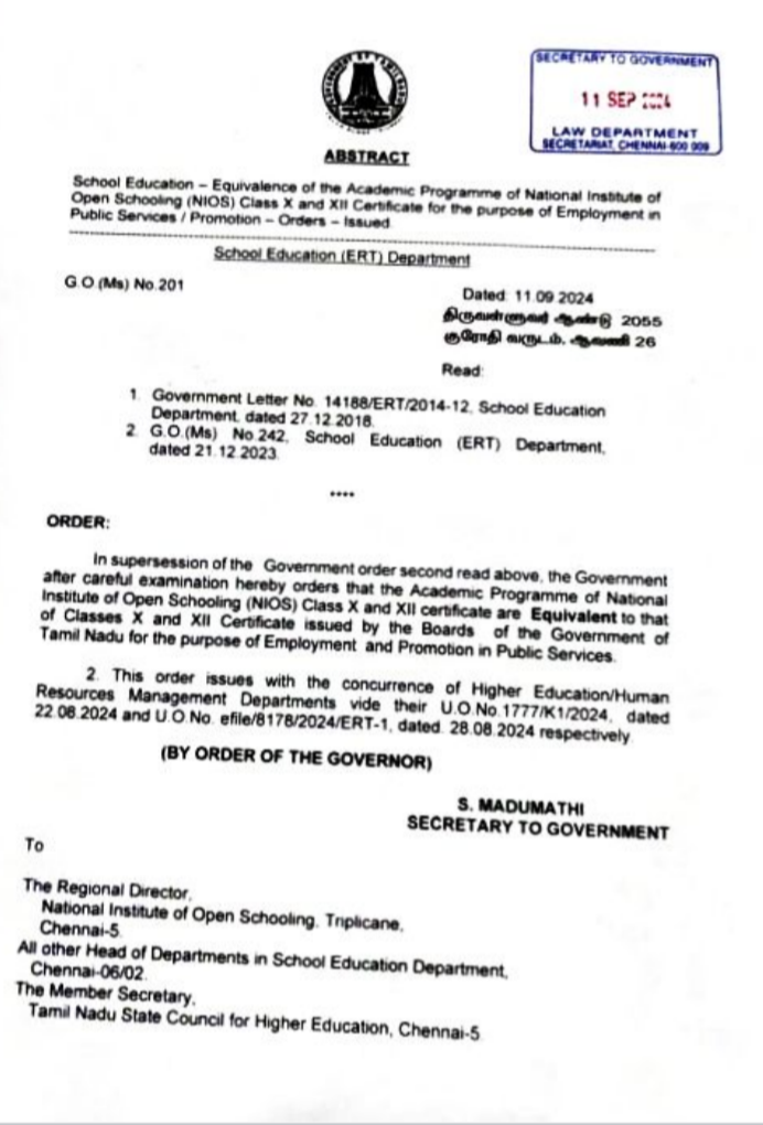 NIOS -ல் (அதாவது Home School) தேர்வுகளில் 10-வது – 12வது தேர்ச்சி பெற்ற மாணவர்களை இதுவரை தமிழ்நாடு அரசு அங்கீகரிக்காமல் இருந்தது. இப்பொழுது தமிழக அரசே அங்கீகரித்து பள்ளி கல்வி அலுவலகங்களுக்கு NIOS -ல் தேர்வு பெற்றவர்களை State board – ல் படித்தவர்களுடன் equal – ஆக அங்கீகரித்து கடிதம் கொடுத்துள்ளது. தமிழக அரசுக்கு நன்றி.